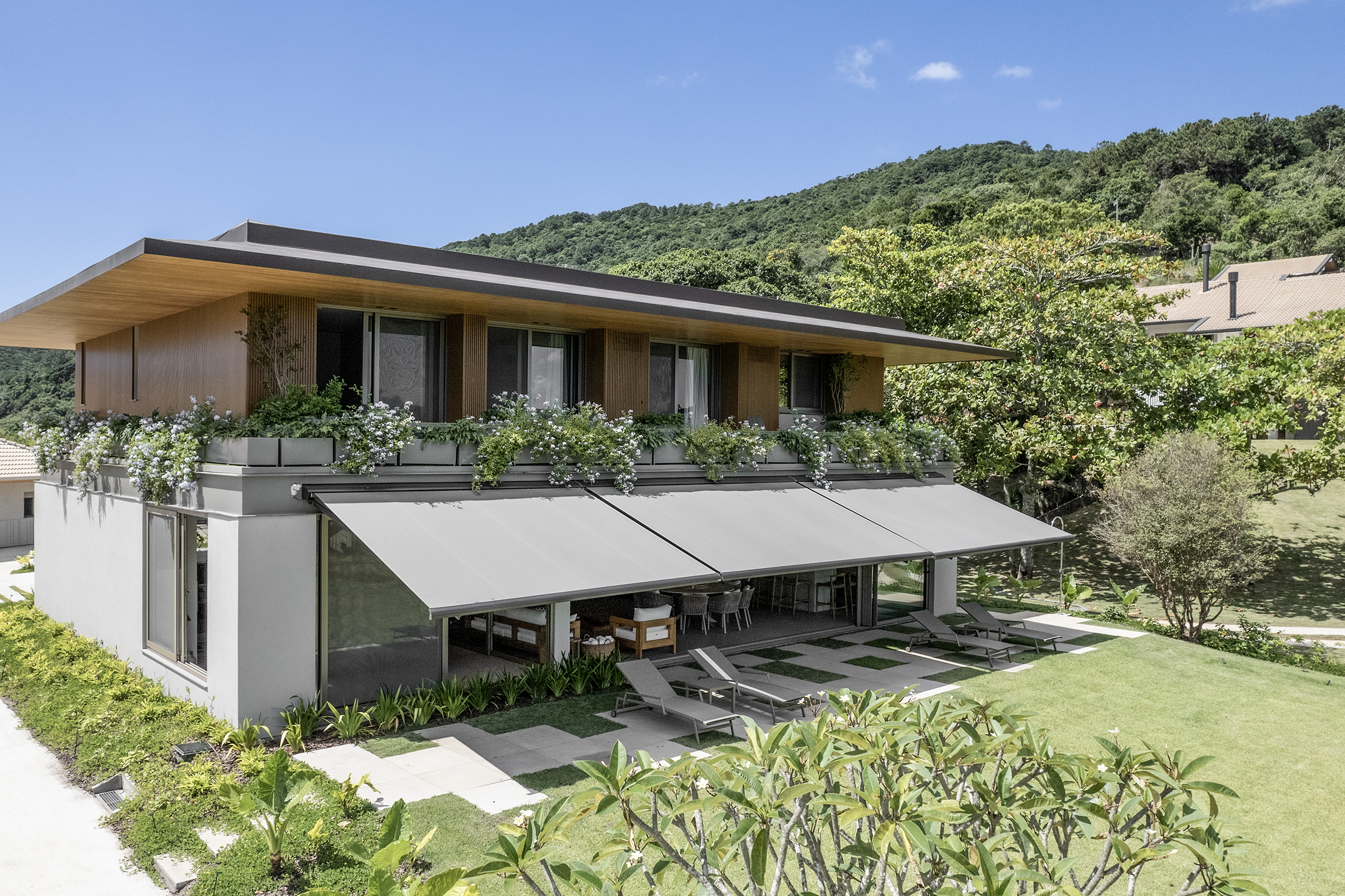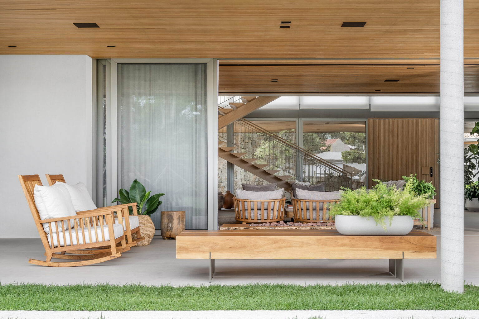 O grande destaque fica por conta do mobiliário assinado pela Franccino Florianópolis, cuidadosamente escolhido pelos proprietários Vanessa e Rodrigo Gimenez. A curadoria de peças da marca, conhecida pelo design atemporal e sofisticação natural, traduz com perfeição o espírito da casa: um equilíbrio sutil entre conforto, elegância e conexão com o entorno.